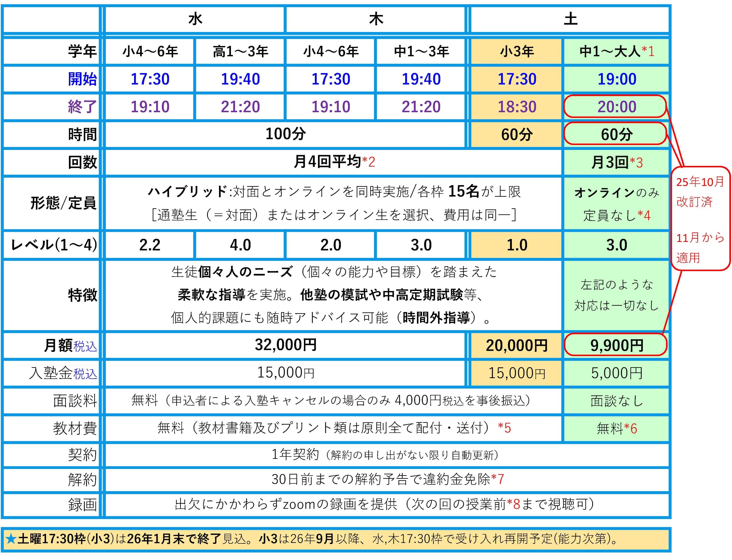 - 土曜19:00枠以外の在籍生徒が土曜19:00枠に移籍する場合は解約とはなりませんが移籍金として30,000円(税込)が発生します(授業料低減分の補償)。