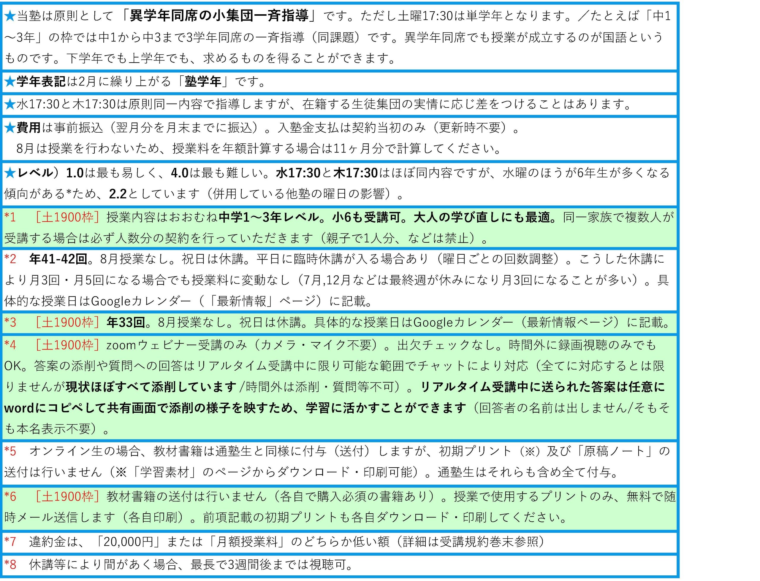 - 宿題は出しません。ただし、22の鉄則や反対語の暗記等、自学すべき内容はあります(学習素材参照)。(長文読解を扱う場合も原則として授業中に読む時間・解く時間を与えますが、土曜19:00枠については時間が短いため、「事前に解いておくように」などと指示をする場合があります)