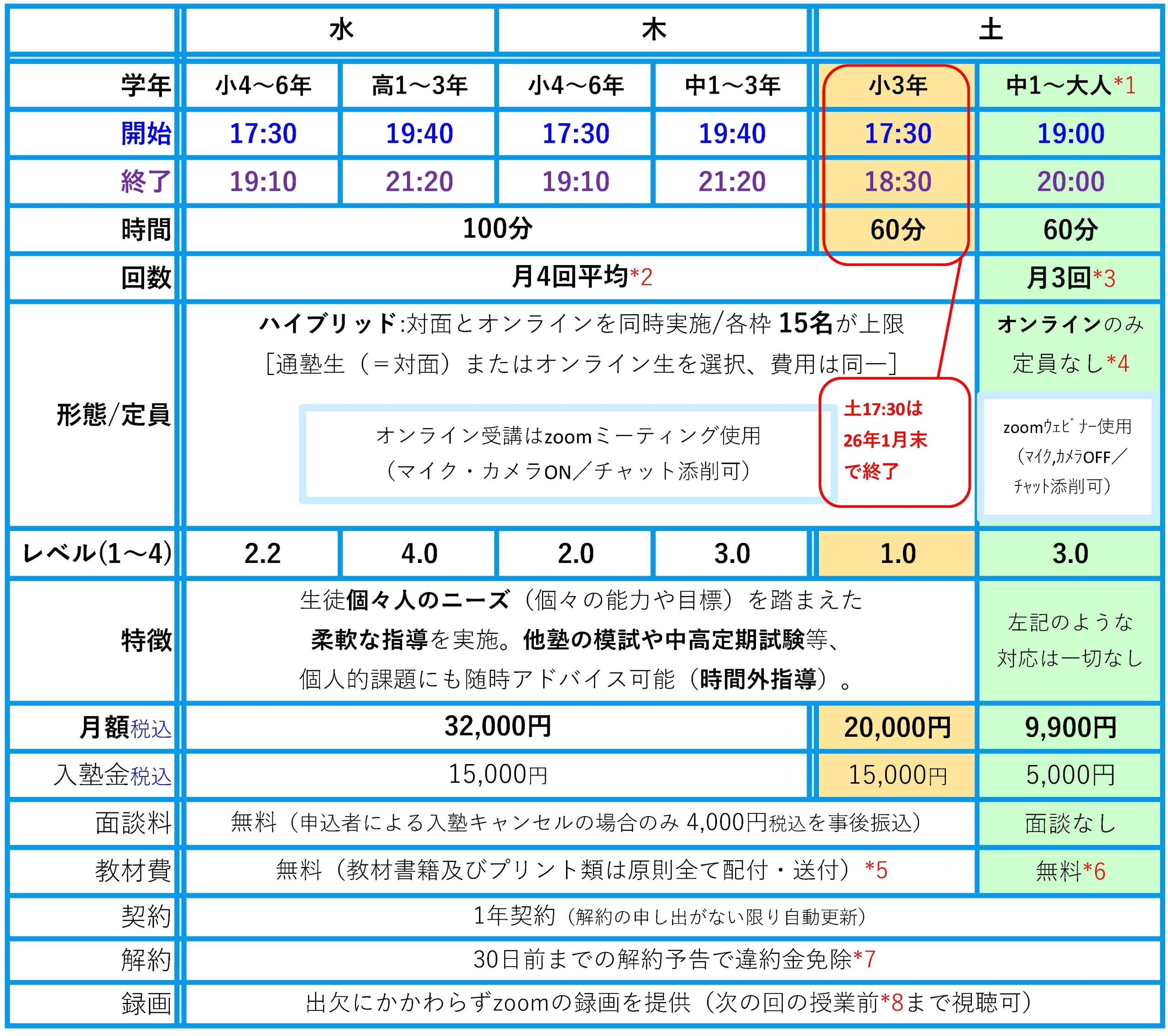 - 土曜19:00枠以外の在籍生徒が土曜19:00枠に移籍する場合は解約とはなりませんが移籍金として30,000円(税込)が発生します(授業料低減分の補償)。