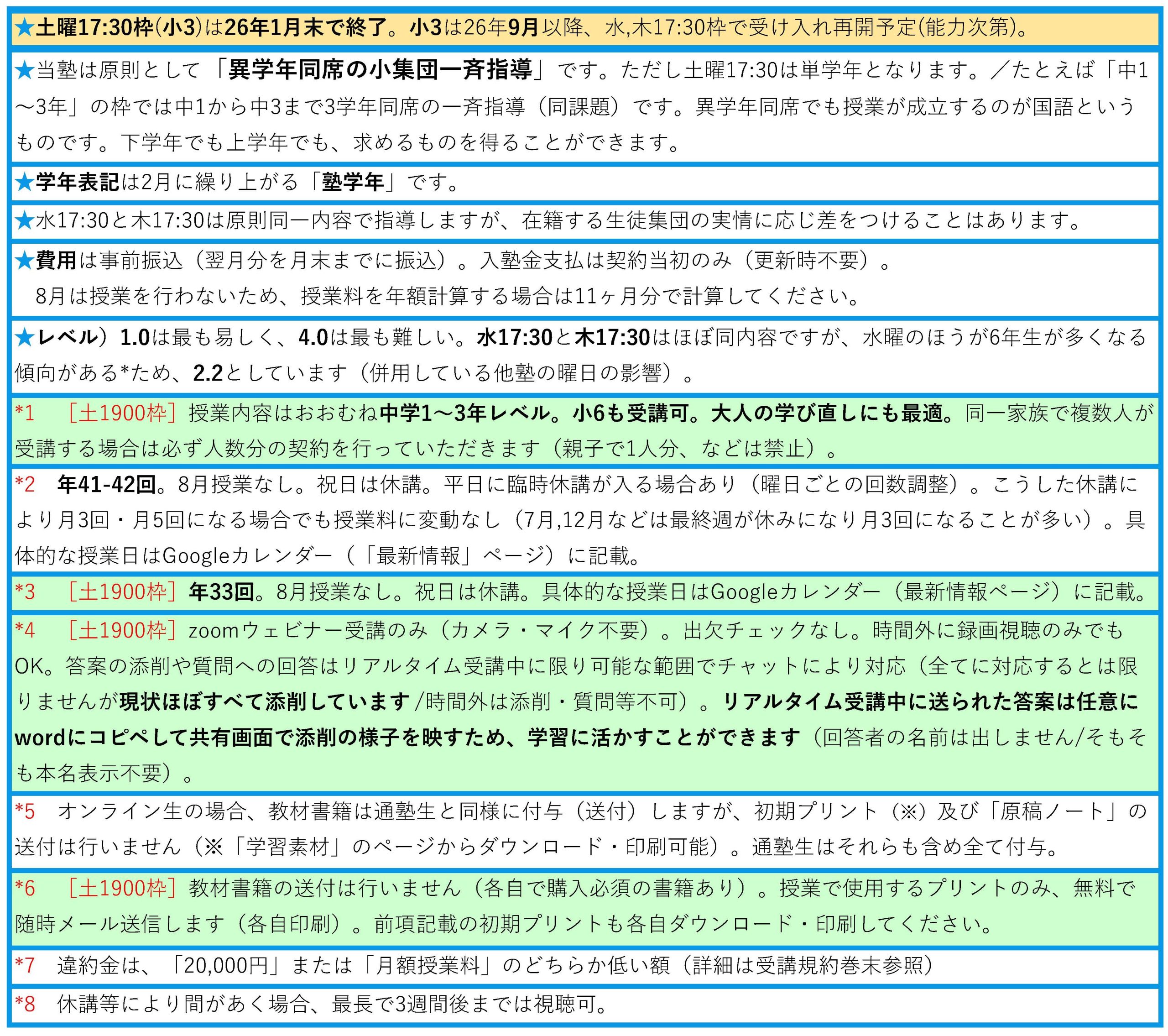 - 変更事項、空き状況、授業日カレンダーは、最新情報に記載しています。必ずご確認ください。
