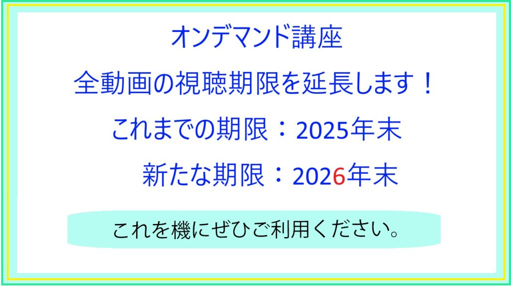 注意)いずれの講座もzoomを利用しているため、必ずしも高画質に感じられないことがあります。/音声と映像(口の動きや共有画面)との間に、わずかなズレが生じることがあります。/若干のノイズが認められる部分が含まれることがあります。